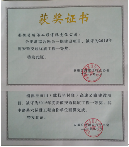 近日傳來好消息,由安徽路港公司承建的績溪至黃山(歙縣呈村降)高速公路工程、合肥港綜合碼頭一期工程榮獲2015年度安徽省交通優質工程一等獎。