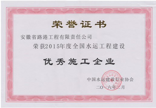 日前,安徽省路港工程有限責任公司榮獲“2015年度全國水運工程建設優秀施工企業稱號”稱號,全國僅22家施工企業獲得該項殊榮。