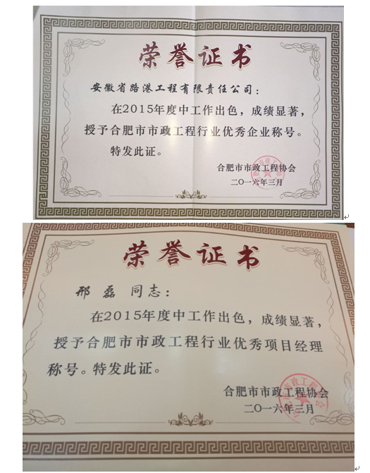 近日,安徽省路港工程有限責任公司榮獲2015年度“合肥市市政工程行業優秀企業”稱號,邢磊同志被授予2015年度“合肥市市政工程行業優秀項目經理”稱號。