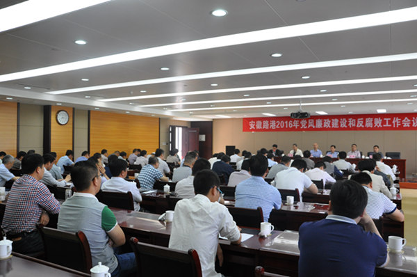 5月6日上午,安徽路港公司在省黨風廉政建設教育基地召開2016年黨風廉政建設和反腐敗工作會議,傳達貫徹省國資委、集團黨委黨風廉政建設和反腐敗工作會議精神,部署了公司2016年紀檢監察工作。公司機關部門副職及以上人員、機關全體黨員、子(分)公司領導班子成員、各項目經理及支部書記共有98人參加會議,黨委副書記馬斌主持會議。
