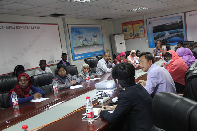 項目部首先向桑給巴爾客人介紹了公司基本情況以及郎溪路四標項目的概況、工程質量、進度、安全文明管理等工作,隨后去施工現場進行了觀摩。