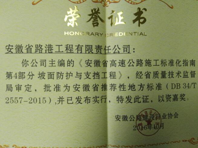 2016年10月31日,安徽省高速公路建設標準化指南編制工作總結表彰會在省交通質監局召開,省交通廳領導、省交通質監局領導、指南編制單位的分管領導、部分編寫人員參加了會議。會議由省公路建設行業協會主持。安徽路港因主持編寫了《安徽省高速公路施工標準化第4部分 坡面防護與支擋工程》(DB34/T2557-2015)在總結會上獲表彰。