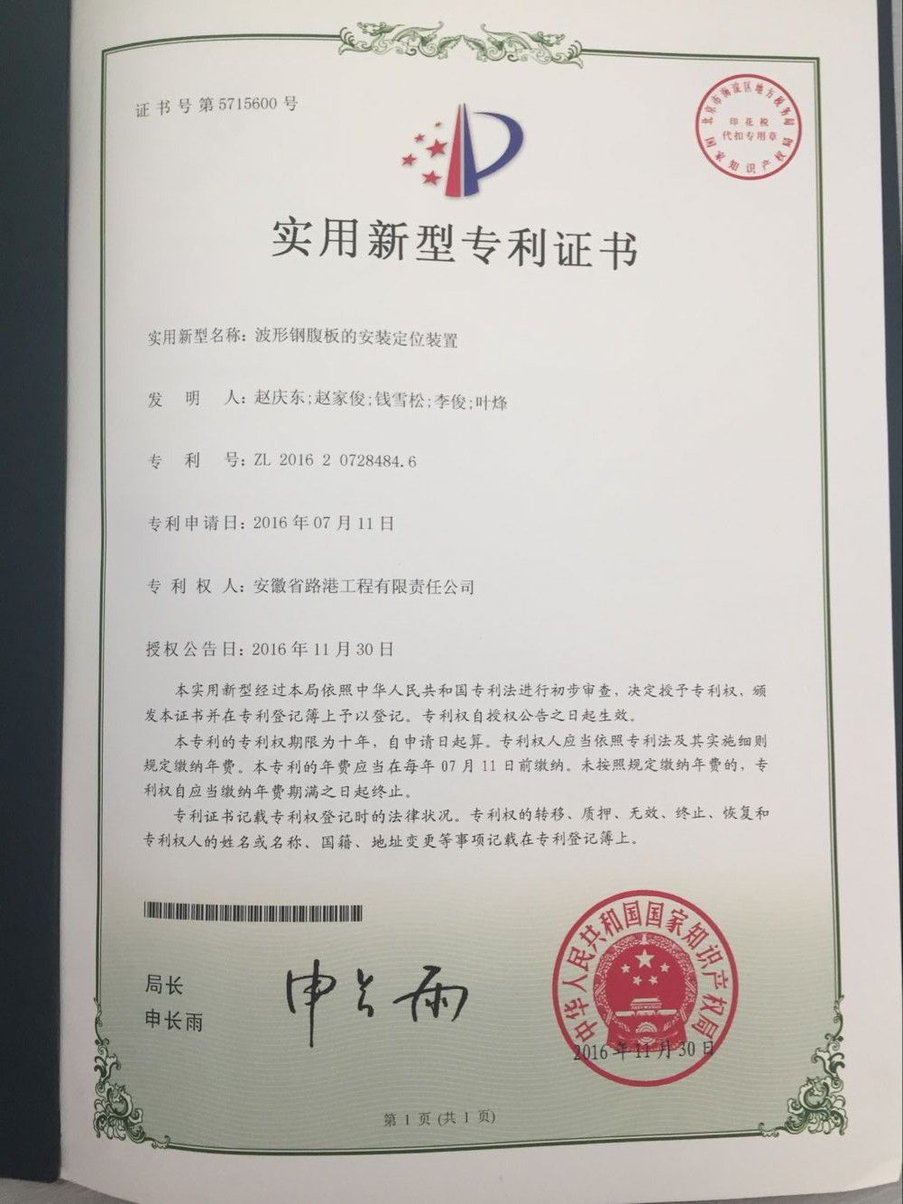 日前,由安徽省路港公司申報的“波形鋼腹板的安裝定位裝置”通過實用新型專利,專利號為:ZL 2016 2 0728484.6。該專利技術在我公司合肥市郎溪路高架04標南淝河特大橋成功運用,并提煉出成果,該技術中采用的輕型工裝裝置,便于搬運、施工,節省了大量人工與材料,大大提高了安裝功效,降低了施工成本。
