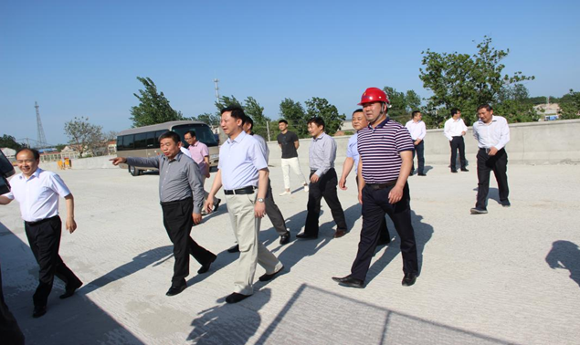 黃曉武一行實地查看了澮河南坪船閘S305跨閘公路橋及船閘主體工程的建設情況,項目負責人就現場目前工程施工進展情況及施工過程中存在的地方問題進行了匯報。