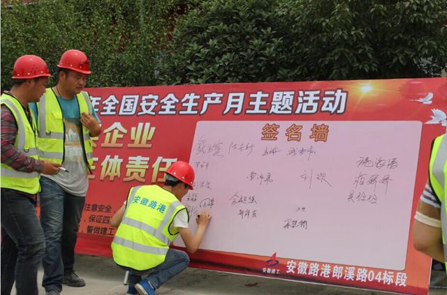 我是一名安徽建工人,我鄭重宣誓:時刻注意安全,遵守安全法規。履行安全職責,提高安全技能。杜絕三違現象,保證四不傷害。強化紅線意識,促進安全發展。為了家人幸福、企業發展,誓做建工“安全人”。錚錚誓言響徹云霄,筆尖揮斥千金承諾。6月1日至2日,安徽路港公司機關及所屬各單位、項目部莊嚴舉行了2017年“安全生產月”宣誓簽名儀式,拉開了今年以“全面落實企業安全生產主體責任”為主題的“安全生產月”系列活動序幕。