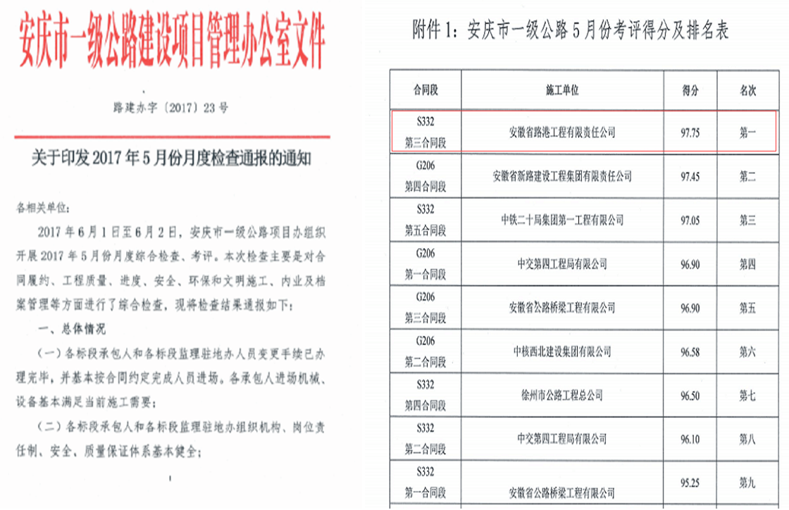 近日,安徽路港S332安慶改建工程施工三標項目部在建設單位5月份月度考評的9家施工單位中過關斬將、一路領先,在合同管理、質量管理、安全管理、文明管理及進度等方面,以綜合評分97.75分的好成績,再次獲得5月份綜合考評第一名,這是該項目部4月份獲得月度考評第一名后,連續兩次獲得此項殊榮。
