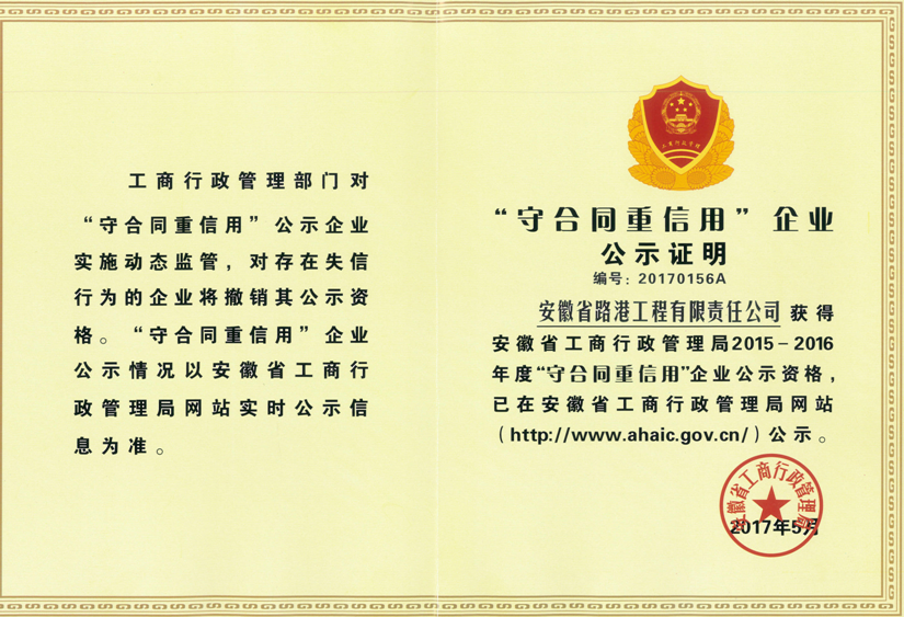 日前,安徽省工商行政管理局授予安徽路港公司“20152016年度省級守合同重信用企業”稱號。