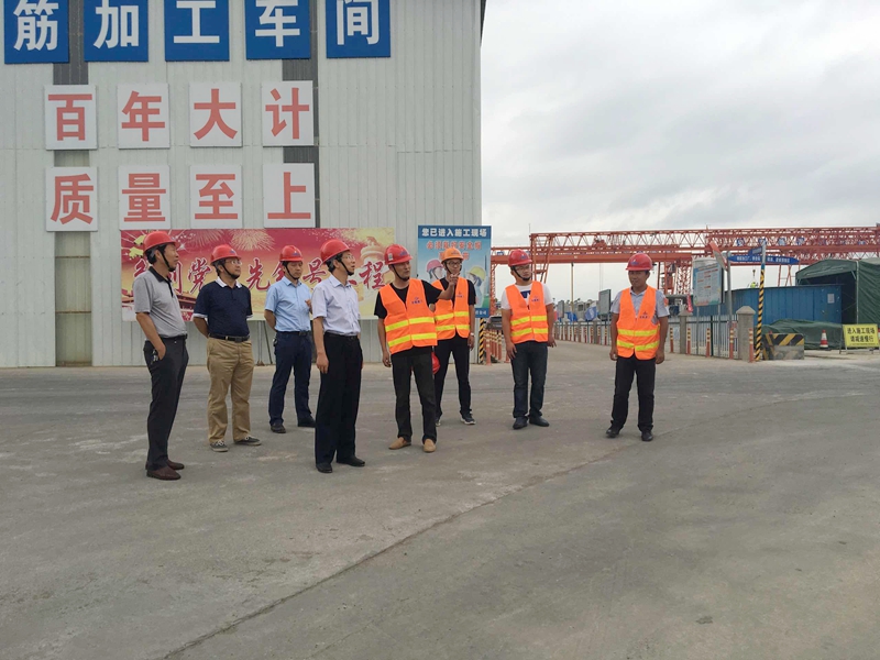 王總一行深入施工現(xiàn)場,先后查看了混凝土拌合站、鋼筋加工廠、箱涵預制區(qū)、梁板預制區(qū),聽取了項目負責人關(guān)于施工過程中重難點、關(guān)鍵工序、新工藝應用的匯報,對混凝土露骨料水洗劑施工工藝在節(jié)約成本、提高效益方面給予表揚。