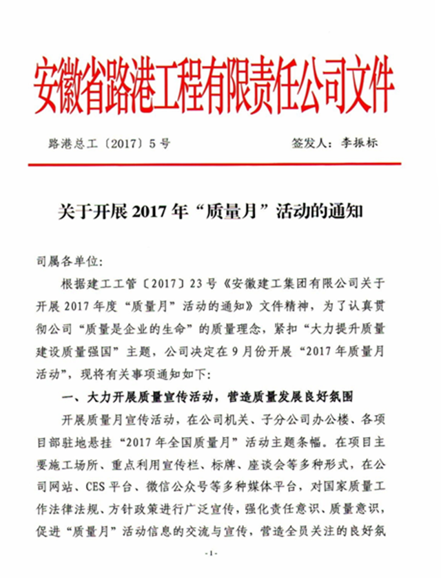 20179月,安徽路港公司緊扣“大力提升質(zhì)量  建設質(zhì)量強國”活動主題,認真貫徹公司“質(zhì)量是企業(yè)的生命”的質(zhì)量理念,多措并舉扎實開展2017年“質(zhì)量月”活動。