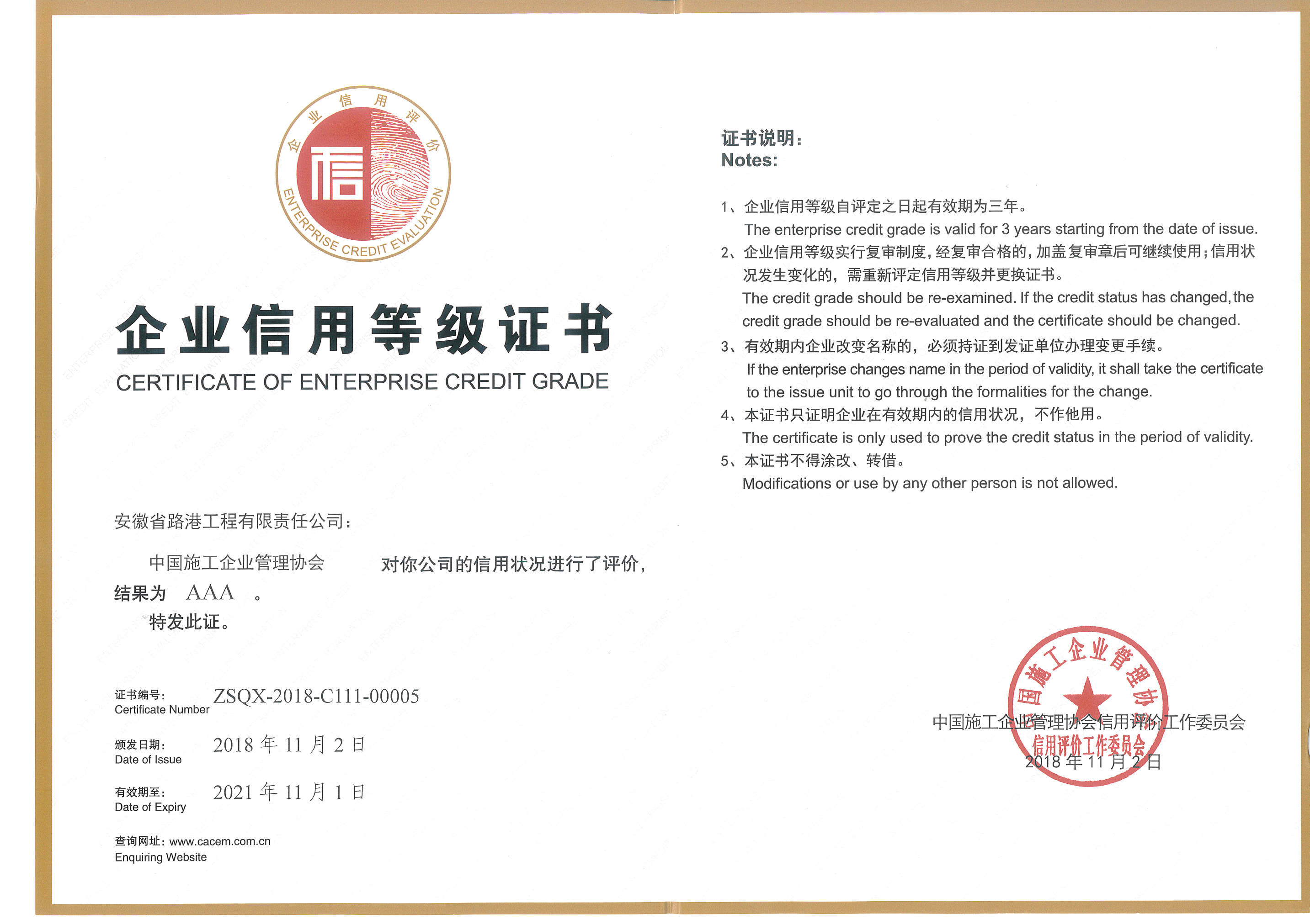 安徽路港獲評中國施工企業管理協會AAA級信用企業