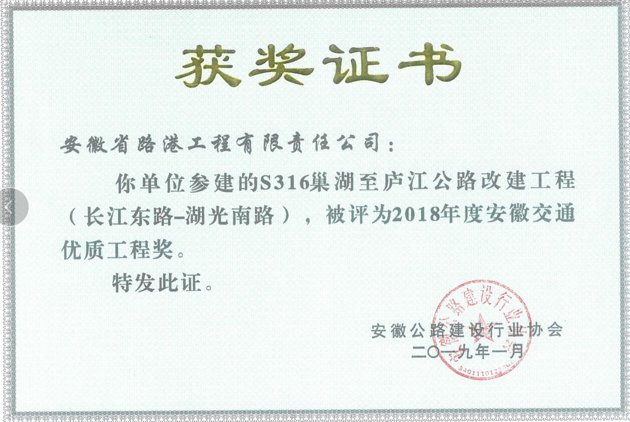 近日,從安徽公路建設行業協會傳來喜訊,安徽路港參建的S316巢湖至廬江公路改建工程榮獲2018年度安徽交通優質工程獎,全省共8個工程項目獲獎。