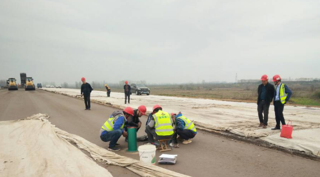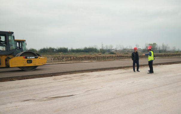 錢總一行深入施工現(xiàn)場,對當前水穩(wěn)攤鋪情況進行了察看,詳細了解了現(xiàn)階段施工的進展情況,仔細聽取了項目負責人關(guān)于目前生產(chǎn)情況及下步工作計劃的匯報,對工程的進度、質(zhì)量及安全環(huán)保提出指導性意見。
