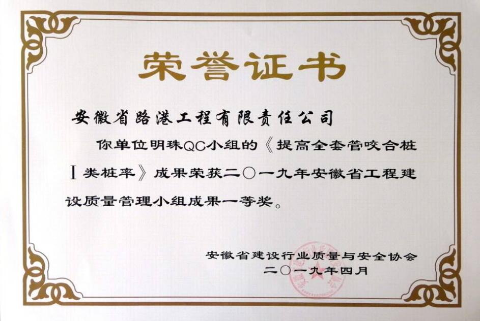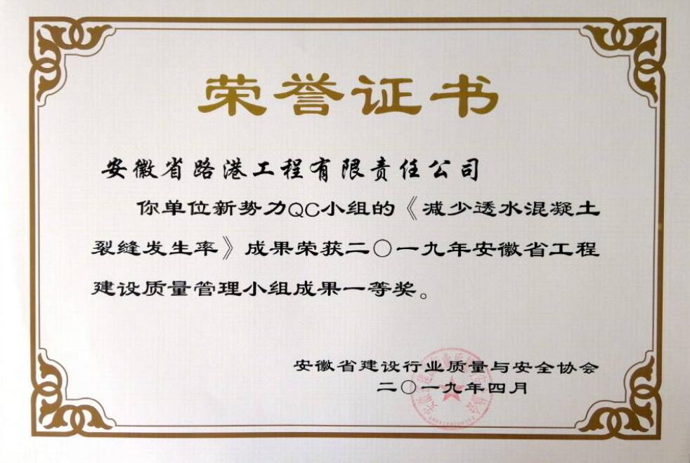 日前,從安徽省建設(shè)行業(yè)質(zhì)量與安全協(xié)會傳來喜訊,安徽省路港工程有限責(zé)任公司明珠QC小組的《提高全套管咬合樁Ⅰ類樁率》、新勢力QC小組的《減少透水混凝土裂縫發(fā)生率》、創(chuàng)新QC小組的《研制一種預(yù)制箱梁腹板新型噴淋系統(tǒng)》3項(xiàng)成果均榮獲二一九年安徽省工程建設(shè)質(zhì)量管理小組成果一等獎。