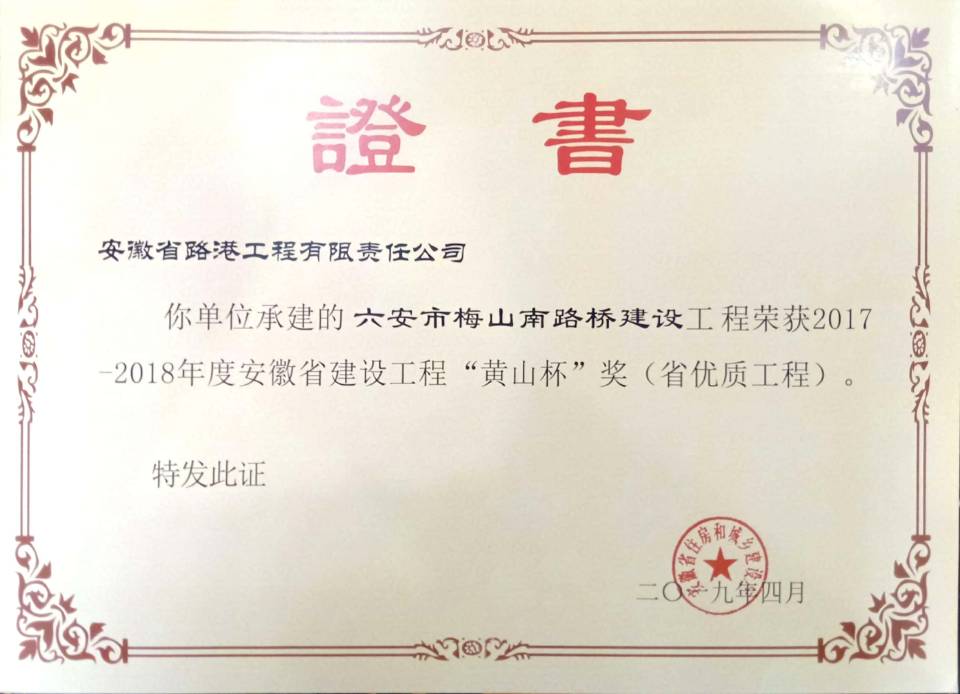 “黃山杯”獎是我省建筑行業建設工程質量的最高榮譽獎。安徽路港公司通過精心組織策劃,從省交通廳系統申報了澮河固鎮復線船閘工程、蚌淮高速高塘湖特大橋兩個項目。六安市梅山南路橋項目從市政行業渠道申報,先創建六安市建筑施工安全質量標準示范工地,再申報地方優質工程獎“皋城杯”,為最終獲得“黃山杯”獎奠定了堅實基礎。