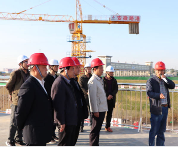 余總經理一行先來到靈璧船閘工程施工現場、料倉大棚、鋼筋加工場進行實地察看。在聽取項目負責人對現場施工管理、標準化建設、工藝創新等相關情況介紹后,余正發總經理對項目建設進展給予了充分肯定,并對項目建設過程中采用的新技術、新工藝、新工法表示高度贊揚。