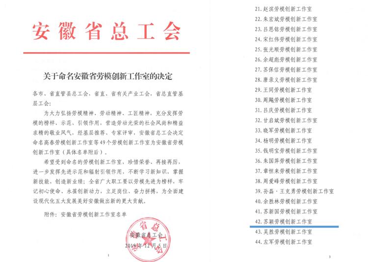 “蘇穎勞模創新工作室”榮獲“安徽省勞模創新工作室”稱號