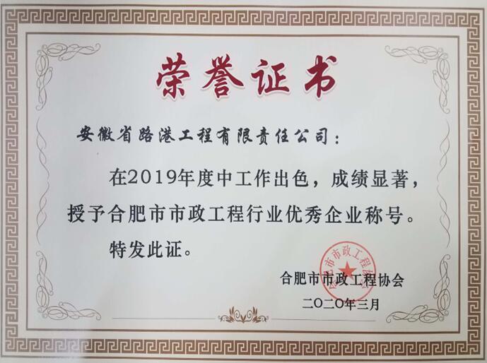公司榮獲2019年度合肥市市政工程行業(yè)優(yōu)秀企業(yè)