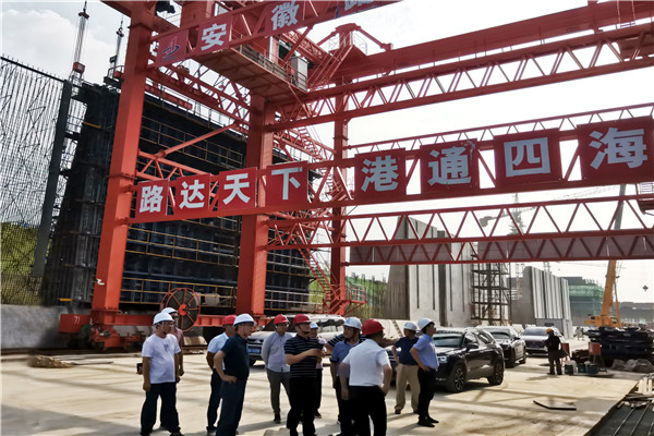 7月7日下午,安徽省交通建設工程質量監督局水運處處長熊偉一行赴靈璧船閘項目檢查指導工作,宿州港投公司董事長汪順利、總經理劉安曠等一同檢查。