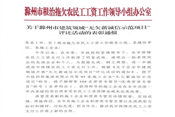 蘇滁滁州大橋項(xiàng)目獲滁州地區(qū)施工企業(yè)“無(wú)欠薪誠(chéng)信示范項(xiàng)目”稱(chēng)號(hào)