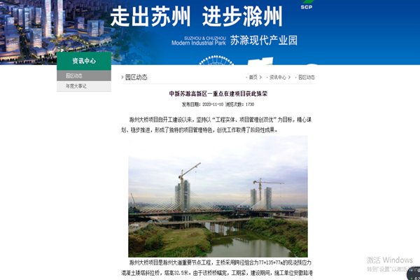 滁州大橋項目獲業主中新蘇滁(滁州)開發有限公司網站登載報道