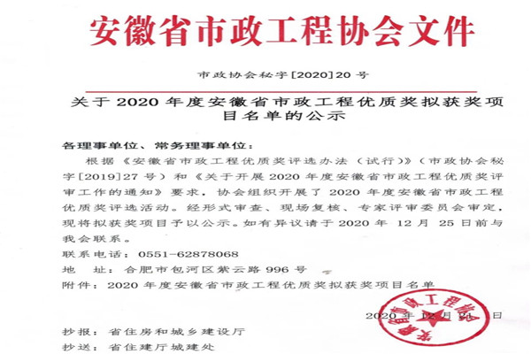 據悉,安徽省市政工程優質獎是安徽省市政工程質量的最高榮譽獎項,是市政工程技術質量及工藝水平先進性和可行性的最好體現。該獎項每年評選一次,需專家評審組結合項目規模特點、有關資料及交竣工驗收的質量評定結果,對符合條件的創優工程進行評選產生。公司依靠精細化管理,多措并舉打造包含內在品質和外在形象的品質工程,以爭創優質工程引導項目質量管理水平的提升,在此次評選中取得豐碩成果。