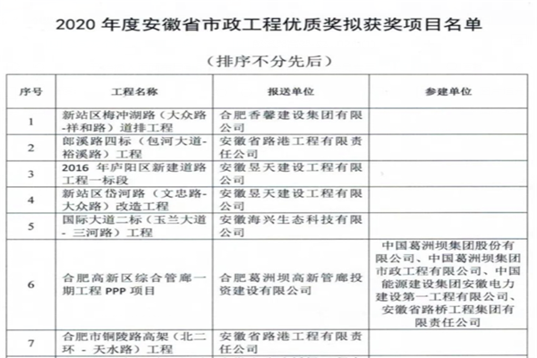 近日,公司承建的郎溪路四標(包河大道-裕溪路)工程、銅陵路高架(北二環-天水路)工程榮獲2020年度安徽省市政工程優質獎。