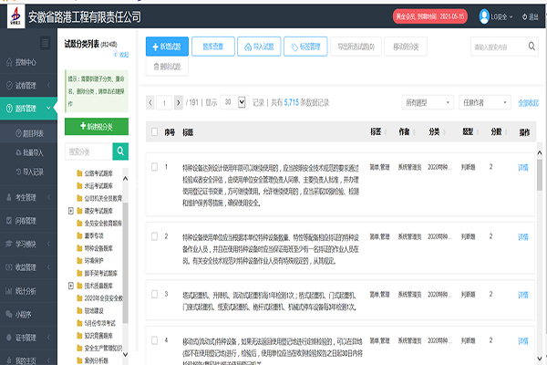 通過使用線上平臺,建立包含特種設備、環境保護、駐地建設、節后復工、疫情防控、崗前考試、全員安全教育等11類、5715道試題的題庫,安全教育不再受時間和距離制約,近年來安全教育頻率大幅度提升。
