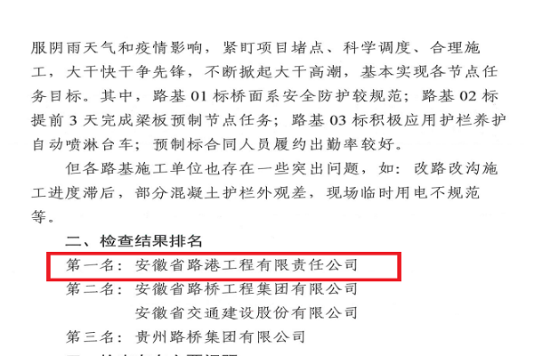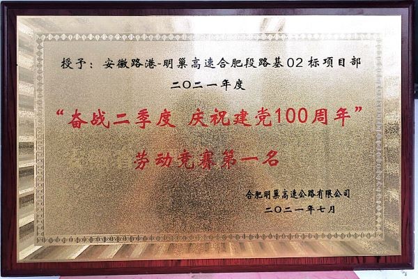 7月27日,一分公司明巢路基02標在明巢高速公路合肥段項目公司第二季度項目綜合考評和勞動競賽考核中均排名第一,李柱、匡卯卯、王峰和趙以紅四人榮獲“先進個人”榮譽稱號。