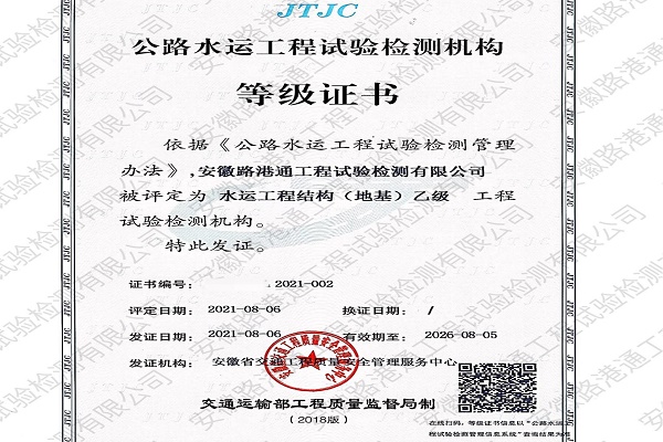 8月10日,路港通檢測(cè)公司收到了安徽省交通工程質(zhì)量安全管理服務(wù)中心頒發(fā)的《水運(yùn)工程結(jié)構(gòu)(地基)乙級(jí)》等級(jí)證書,也是安徽省第二家獲得此項(xiàng)資質(zhì)證書的機(jī)構(gòu),本證書覆蓋港口、船閘、橋梁等結(jié)構(gòu)檢測(cè)參數(shù)。該資質(zhì)的取得,驗(yàn)證了路港通實(shí)際檢測(cè)能力。路港通將以此為契機(jī),繼續(xù)申報(bào)水運(yùn)材料甲級(jí),做到內(nèi)部市場(chǎng)不流失,外部市場(chǎng)有競(jìng)爭(zhēng)力。
