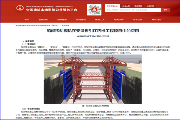 安徽路港公司“船閘移動(dòng)模機(jī)”成功入選住房和城鄉(xiāng)建設(shè)部智能建造新技術(shù)新產(chǎn)品創(chuàng)新服務(wù)典型案例(第一批)