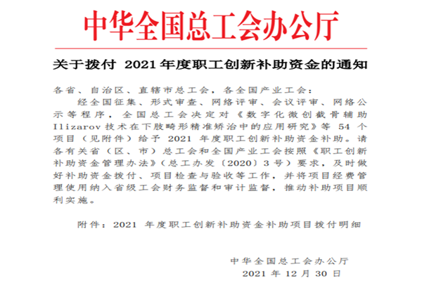 近日,中華全國總工會辦公廳發布《關于撥付2021年度職工創新補助資金的通知》,安徽路港蘇穎勞模創新工作室重點研究課題“新一代‘造閘機’智能成套裝備研發及產業化”榮獲中華全國總工會2021年度職工創新補助金10萬元。