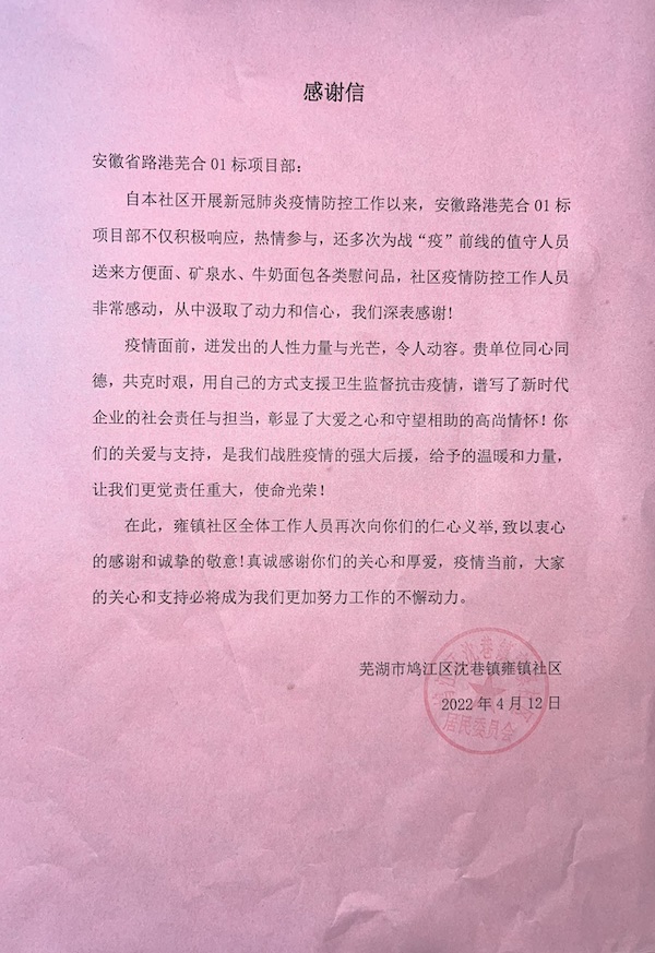 自開展疫情防控工作以來,蕪合01標項目嚴防死守,對內嚴格落實集團、公司各項防疫措施,對外積極配合當地政府各項防疫政策。此外,項目青年職工組成青年突擊隊多次為戰“疫”前線值守人員送去面包、礦泉水、方便面等慰問品,用自己的方式支援抗疫大戰,并收到來自雍鎮社區的感謝信,展現了新時代國有企業的責任與擔當!