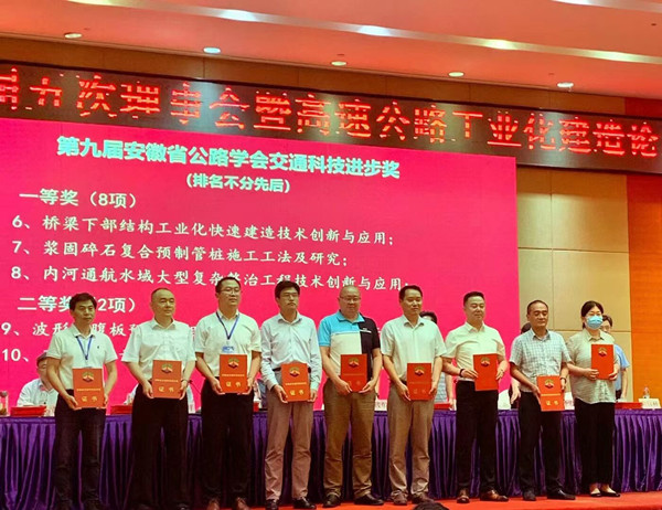 6月22日下午,安徽省公路學會七屆五次理事會在桐城順利召開。會上頒發了第九屆安徽省交通科技進步獎,安徽路港公司作為第一完成單位的科技成果——《復雜水域大跨度寬幅矮塔斜拉橋成套關鍵技術研究》《內河通航水域大型復雜整治工程技術創新與應用》喜獲一等獎?!稄碗s飲用水源保護區橋梁支架體系拆裝成套施工技術研究》《復雜地形大跨徑多節段鋼管拱肋精確安裝施工技術研究》榮獲二等獎,《復雜水域地質條件大體積樁基承臺施工控制關鍵技術研究》榮獲三等獎。公司副總工程師、總工辦主任余夢代表公司領取獲獎證書。