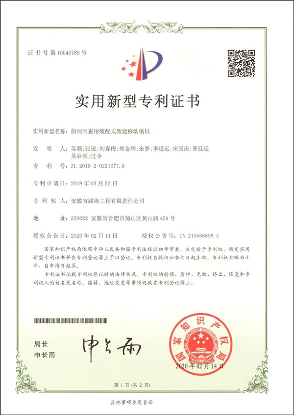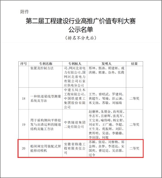 近日,中國施工企業(yè)管理協(xié)會公布了“第二屆工程建設(shè)行業(yè)高推廣價(jià)值專利大賽”評選結(jié)果。經(jīng)形式審查、初賽、復(fù)賽、決賽等多環(huán)節(jié)嚴(yán)格審核,安徽路港公司“船閘閘室用裝配式智能移動(dòng)模機(jī)”專利榮獲大賽二等獎(jiǎng)。