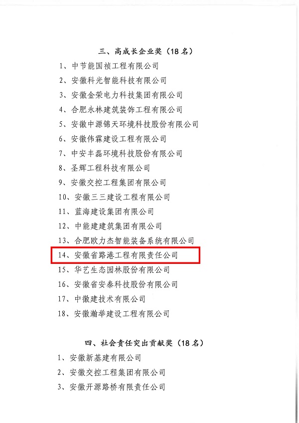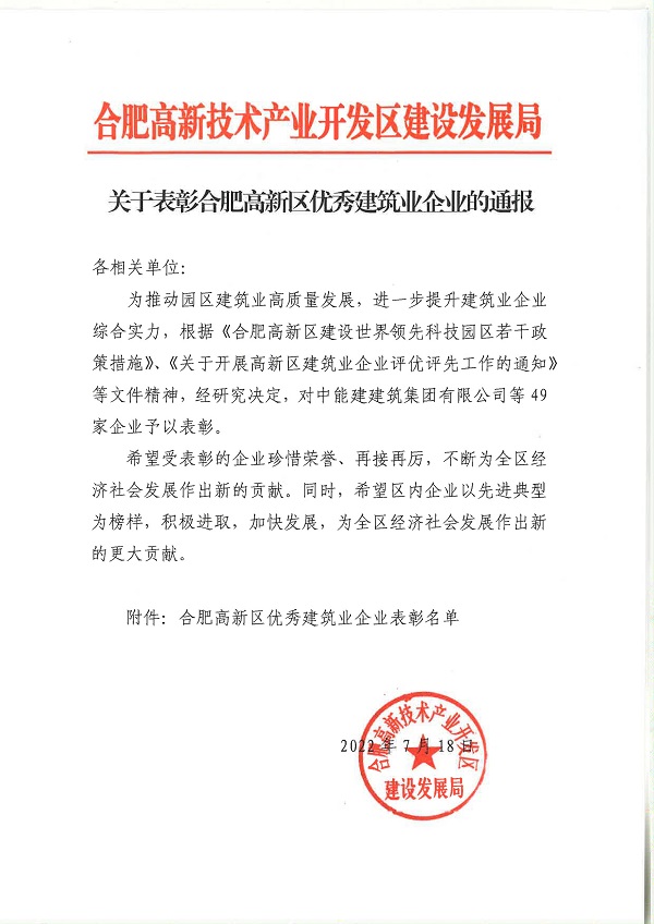 近日,合肥高新技術(shù)產(chǎn)業(yè)開發(fā)區(qū)建設(shè)發(fā)展局發(fā)布了《關(guān)于表彰合肥高新區(qū)優(yōu)秀建筑業(yè)企業(yè)的通報》結(jié)果,我公司榮獲“高成長企業(yè)獎”、“社會責(zé)任突出貢獻獎”、“優(yōu)秀服務(wù)獎”三項榮譽獎項。