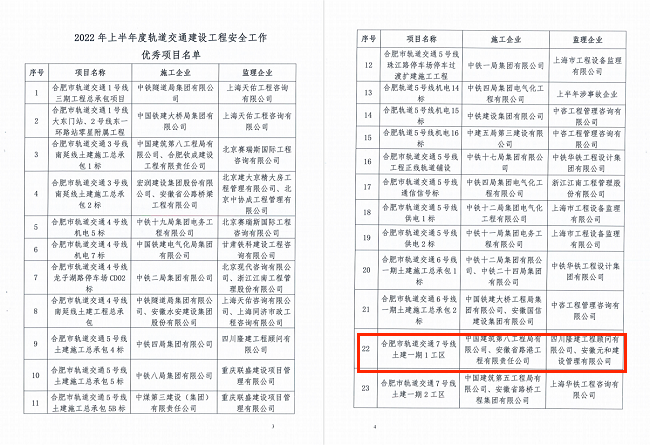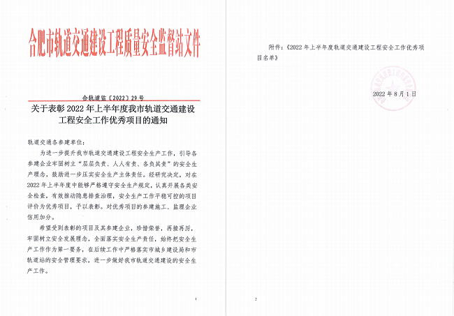 近日,軌道交通7號線項目收到合肥市軌道交通建設工程質量安全監督站發來的表彰文件,對該項目在2022年上半年安全生產管理工作給予高度贊揚,評為優秀項目,并給予公司信用加分。