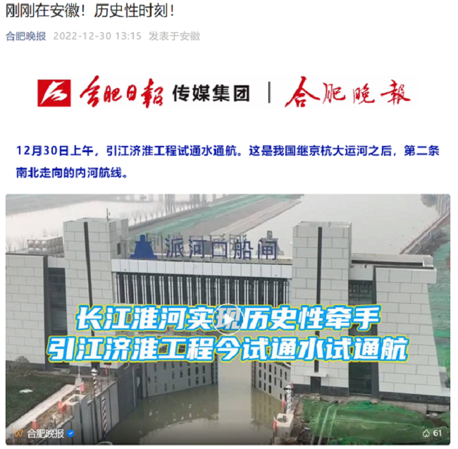 媒體報道丨人民網、安徽日報、合肥日報等主流媒體聚焦引江濟淮工程試通水通航