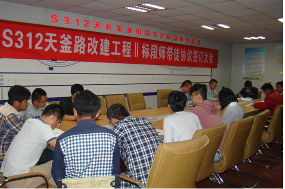 10月25日,S312天釜路改建工程II標段項目部在會議室隆重召開了“師帶徒”協議簽訂大會,共有8對師徒參加了此次會議,涉及技術員、試驗員、財務等多個崗位。