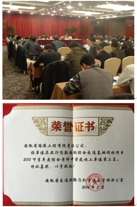 3月7日,亞行貸款安徽綜合交通基礎(chǔ)設(shè)施項(xiàng)目2016年度建設(shè)管理會議在合肥召開,會議對2015年度綜合考評結(jié)果進(jìn)行了通報,安徽路港G206東流至堯渡段建設(shè)工程02標(biāo)項(xiàng)目榮獲全省施工單位綜合考評第三名佳績。