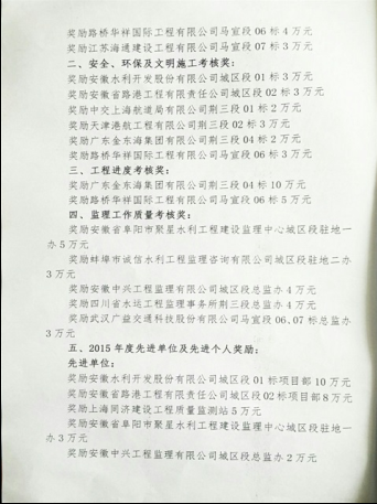 蕪申運河城區段02標2015年在工程質量、工程進度、完成產值都圓滿完成業主計劃進度目標,獲得業主2015年度工程質量考核獎5萬元、安全環保及文明施工考核獎3萬元、先進單位獎勵8萬元,同時邢磊同志、石英卓同志因表現突出,分獲先進個人獎勵5000元,共計17萬元。