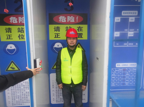 班前會中安全教育活動,施工人員進行安全帽撞擊體驗