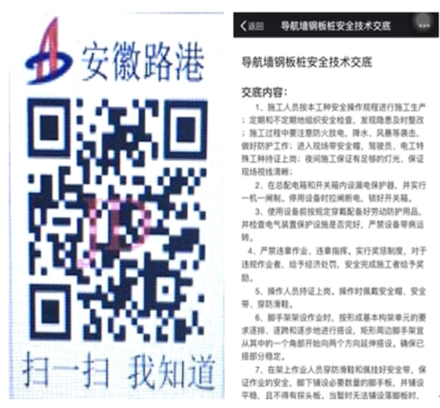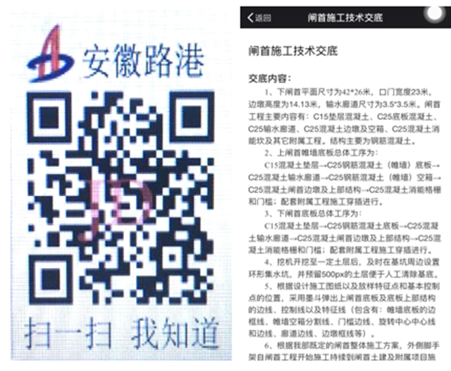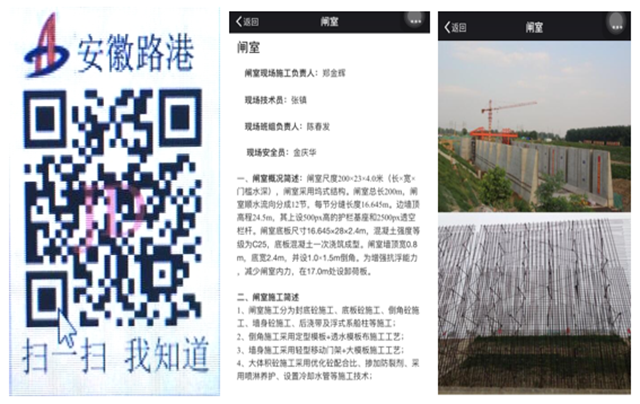 近日,在南坪船閘項目部駐地和施工現場,現場技術員和班組工人拿著手機,對著識別卡和展板上的二維碼掃一掃,“