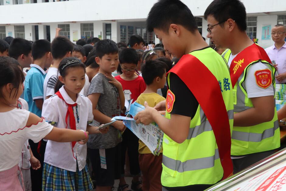 青年志愿者們向小學生發(fā)放安全知識宣傳單和宣傳冊,與小朋友們互動交流,講解安全知識,耐心細致回答小朋友的問題。