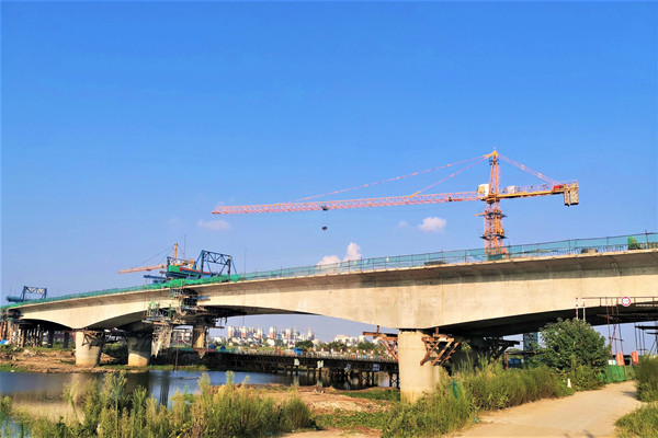 得勝河大橋全長760m,其中主橋長220m,雙幅布置。主橋上部結構采用單箱單室預應力混凝土連續箱梁,利用掛籃懸臂澆筑法進行施工。建設過程中,項目部克服了資金緊張、洪水侵襲、周邊房屋及桿線拆遷、高溫天氣等施工難題,科學組織、統籌安排,目前引橋已完成68片箱梁預制及6跨預制箱梁架設工作,剩余路基灰土正在全面開展施工,路面水穩攤鋪穩步推進。