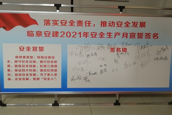 會議宣貫了集團公司“安全生產月”活動文件,觀看了《習近平總書記關于安全生產重要論述-生命重于泰山》專題視頻,通報了安徽省近期安全生產事故,對安全工作做出部署。會議強調:一是重視危險源排查,降低安全風險;二是加強特種設備拆除過程安全管理;三是加強高溫天氣和汛期安全管理,合理安排作息時間,根據現場實際情況制定防汛應急預案,配足應急物資;四是針對夏季雷電大風天氣,做好高大設備、設施防雷措施;五是對取土坑、深基坑進行排查,及時修復圍擋,并對周邊村莊、學校下發防溺水宣傳單,杜絕溺水事件;六是圍繞“落實安全責任、推動安全發展”活動主題,落實安全工作“一崗雙責”。最后,與會人員進行“安全生產月”落實安全責任宣誓、簽名活動。