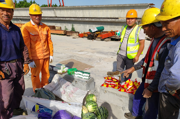 項目部結合施工人員實際需要,切實為職工辦實事,以實際行動踐行“我為群眾辦實事”活動,將藿香正氣水、十滴水、風油精、綠豆、白砂糖及西瓜等防暑物資發放到一線工人手中,并告知施工人員高溫季節施工作業注意事項,叮囑大家注意勞逸結合,預防高溫中暑。一線施工人員感受到項目部的關懷,紛紛表示會以更飽滿的熱情投身施工生產,保質保量完成各項任務。