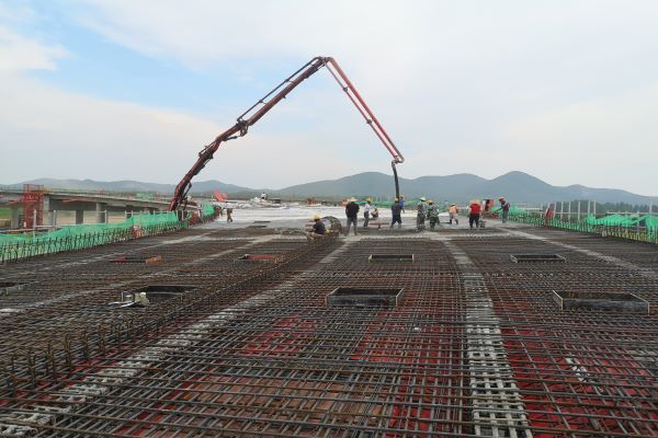 7月11日,一分公司明巢高速合肥段路基02標蘇灣互通AK1+043.5匝道橋第四聯箱梁頂板混凝土澆筑結束,標志著該標段現澆箱梁施工全部完成。