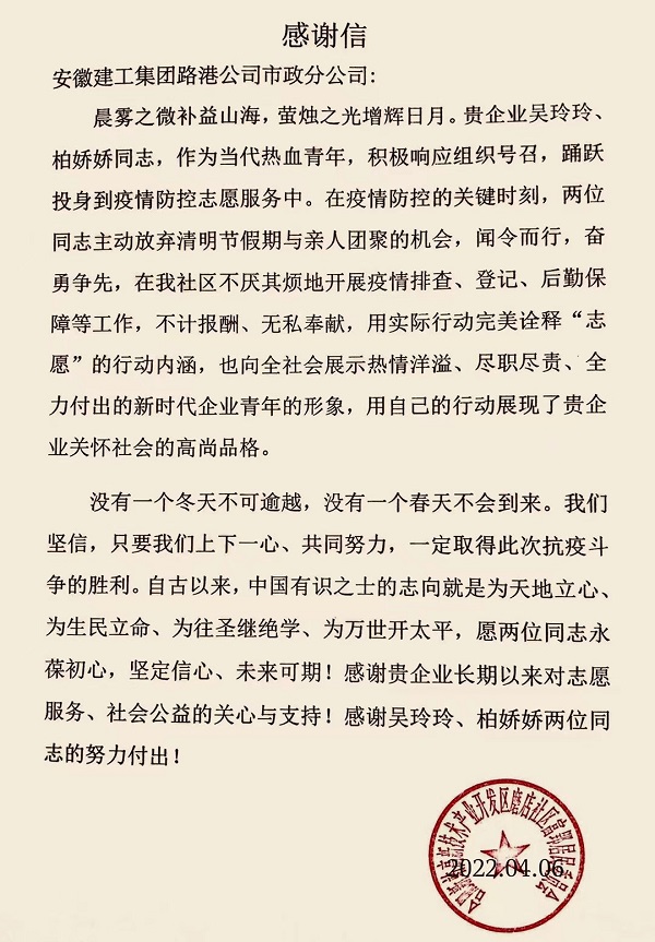 清明節期間,分公司員工吳玲玲與柏嬌嬌赴新站區磨店社區參與志愿服務活動,全力配合社區完成疫情排查、人員信息登記、后勤保障等工作,為此新站區磨店社區特發來感謝信。