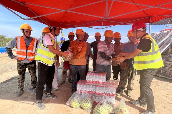 施工現場支起納涼棚,安全分管負責人為各位工友切分西瓜、發放飲用水,檢查他們是否隨身攜帶十滴水、仁丹、藿香正氣液等防暑降溫藥品。項目負責人強調:各工區負責人要科學安排施工作業,合理避開高溫時段,安全負責人要做到防暑降溫安全教育及藥品發放覆蓋全體班組人員,同時要嚴格落實夏季施工規范,保證工程施工安全。