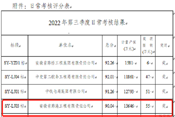 壽潁高速03標項目在疫情特殊時期,牢牢把握“疫情要防住、生產要穩住、安全要把住”的安全生產理念,在做好防疫工作的同時,通過自我加壓,緊密部署產值目標、施工計劃、施工組織等重點工作,積極調動廣大職工的責任感、緊迫感,有效發揮了勞動競賽“學、比、拼、超”積極作用,在安徽交控集團合周高速壽潁段項目辦開展的2022年第三季度考核結果中,得分優異,獲得了業主給予的55萬元的獎勵。